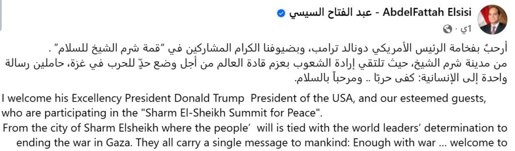 “أرحب بفخامة الرئيس الأمريكي دونالد ترامب، وبضيوفنا الكرام المشاركين في قمة شرم الشيخ للسلام.. من مدينة شرم الشيخ، حيث تلتقي إرادة الشعوب بعزم قادة العالم من أجل وضع حد للحرب في غزة، حاملين رسالة واحدة إلى الإنسانية: كفى حرباً.. ومرحبا بالسلام.”