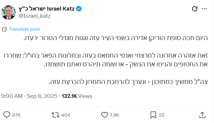وقال كاتس في تصريح عبر منصة “إكس”، الاثنين: “اليوم سيضرب إعصار هائل سماء مدينة غزة، وستهتز أبراج الإرهاب. هذا إنذار أخير لعناصر وقادة حماس في غزة وفي الفنادق الفاخرة بالخارج: أطلقوا سراح الرهائن وألقوا سلاحكم، وإلا فستدمر غزة وأنتم معها.”