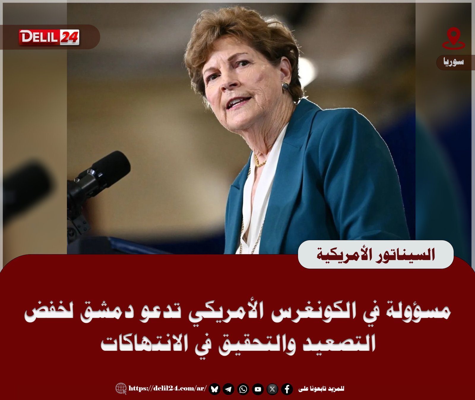 دعت السيناتور الأمريكية جين شاهين، المسؤولة في لجنة العلاقات الخارجية بالكونغرس، الحكومة السورية إلى خفض التصعيد العسكري مع قوات سوريا الديمقراطية، وفتح تحقيق في الانتهاكات المرتكبة، محذّرةً من تداعيات استمرار العنف.