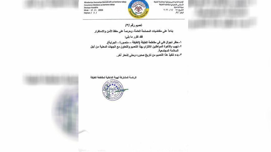 Desteya Ewlekariya Hundirîn îro ragihandin ku ji bo parastina ewlehî û aramiyê û parastina berjewendiya giştî, li parêzgeha Tebqa, ku bajarên Tebqa, Mensûra û Curniyê digire nav xwe, qedexeya derketina derve ya tevahî ferz kirin.