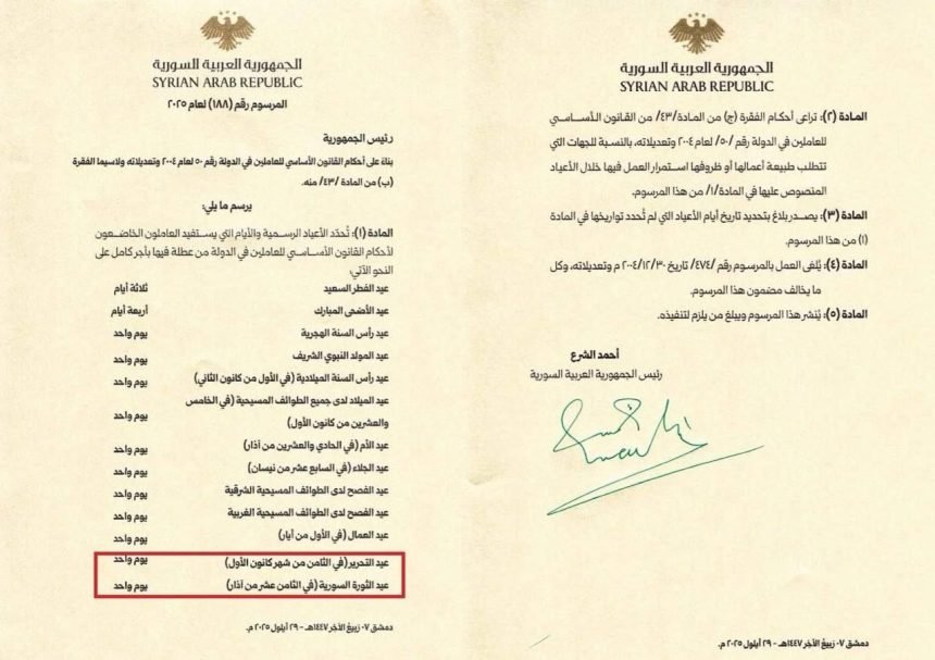 The head of Syria’s transitional government, Ahmed Al-Sharaa, issued Decree No. 188 for the year 2025, which defines the list of official holidays and paid leaves for employees in state institutions. The decree sparked extensive debate in popular and political circles after excluding several national and historical occasions.