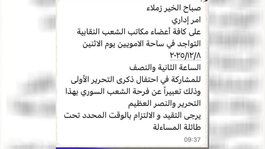 Suriye’deki geçiş hükümetinin Siyasi İşler Genel Sekreterliği, “Baas rejiminin düşüşü” yıldönümüne özel kutlamalarda geniş çaplı örgütsel tedbirler uygulamaya yöneliyor. Eğitim ve hizmet kurumlarına gönderilen genelgelerde, etkinliklere zorunlu katılım, bayrakların asılması ve okullar ile resmî dairelerde kutlamaların düzenlenmesi çağrısı yapılıyor.